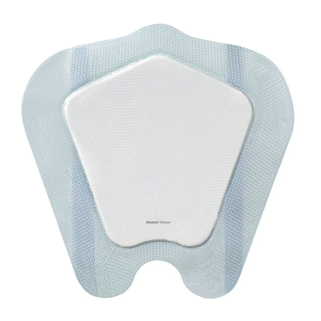 Biatain® Silicone é um curativo de espuma de poliuretano macio e adaptável com uma película superior semipermeável, resistente à água e bactérias, e um adesivo de silicone macio.