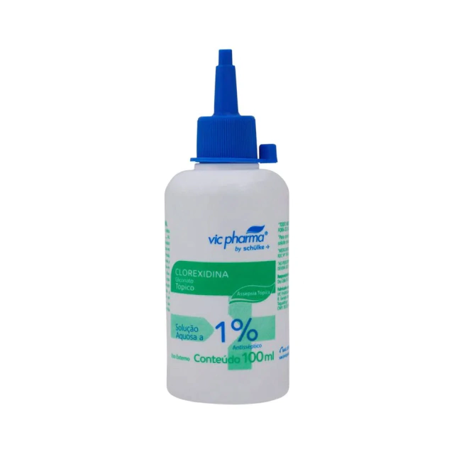 Clorexidina 1% Vic Pharma Solução Aquosa Tópica 100ml Almotolia Utilizado para fazer a assepsia da pele e da mucosa. Solução Aquosa a 1% de gliconato de clorexidina para assepsia. Características do produto: - Não contém álcool; - Antisséptico tópico; - Uso adulto e pediátrico conforma orientação médica.