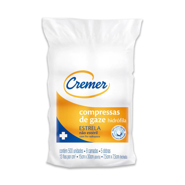 A Compressa de Gaze 13 Fios ESTRELA - CREMER é Indicada para absorção de secreções como sangue e exsudatos, contenção de hemorragias e preoteção de curativos, limpeza e cobertura de curativos em geral e antissepsia da pele e/ou mucosas para procedimentos invasivos;