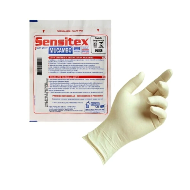 Luva cirúrgica esterilizada produzida à base de látex natural, formato anatômico, lubrificada com pó bioabsorvível e inerte.