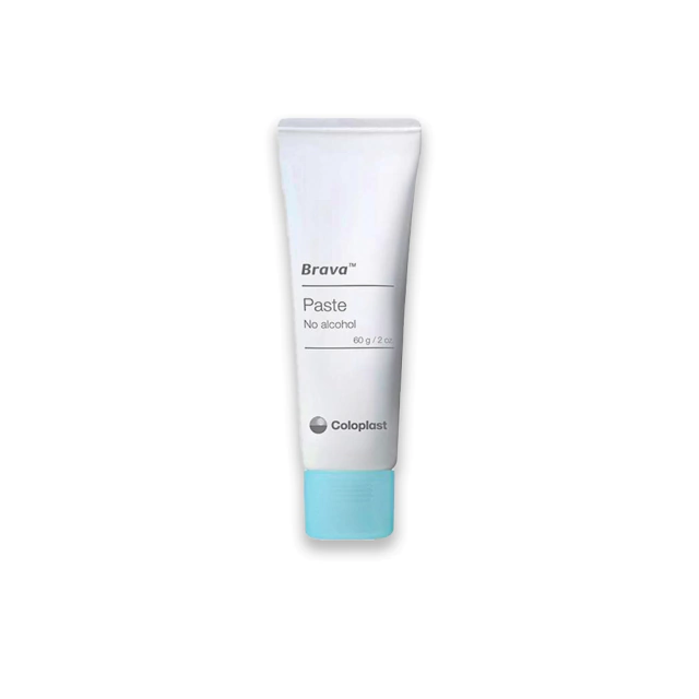 A Brava Pasta para estomias não estéril sem Álcool 12050 - Coloplast - é destinada a preencher cavidades e dobras da pele intacta ao redor do estoma. Isso cria um selamento seguro entre o estoma e a base adesiva protegendo a pele contra os efluentes do estoma.
